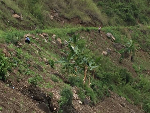 纳翁村隶属于贵州省黔西南州贞丰县鲁容乡,何天龙所在的上傍组自然条件恶劣,被列入易地扶贫搬迁的计划。前一夜的大雨把一户人家砌的台子冲垮了,汽车开不进去,韦川带着记者走了40多分钟的泥泞山路。快到村里的时候,记者在路边见到一位身穿布依族服饰的老人家在极为陡峭的土坡上种苞谷,撒着化肥,一个不稳,老人家差点摔下去,看得人吓了一跳。