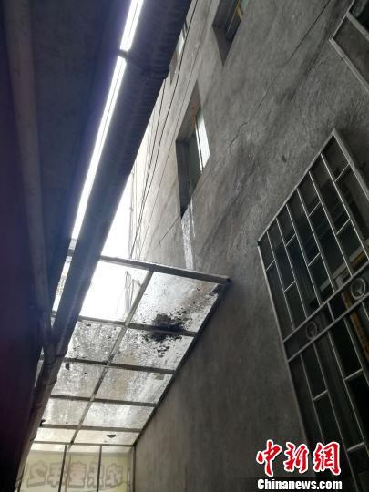 图为事发现场两栋民房间的挡雨棚玻璃被砸穿。伍峰 摄