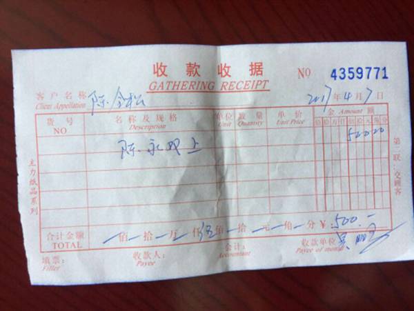 陈永双还给澎湃新闻出示了4月7日他为儿子向看守所交生活费的收款收据。