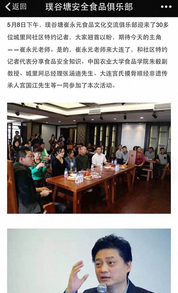 那么,与这些企业相关的崔永元是否就是前央视主持人崔永元呢?澎湃新闻(www.thepaper.cn)发现微信公众号“璞谷塘安全食品俱乐部”5月12日曾发布一篇文章,记录了“崔永元老师来大连了,和社区特约记者分享食品安全知识”,并配有崔永元的现场照片。
