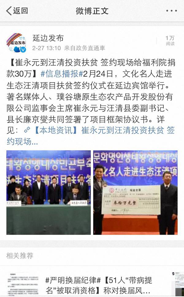 而延边人民政府新闻办公室官方微博“延边发布”在2月27号发布资讯,提到“著名媒体人、璞谷塘原生态农产品开发股份有限公司监事会主席崔永元与汪清县委副书记、县长廉京燮共同签署了项目框架协议书。”