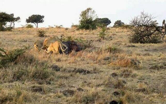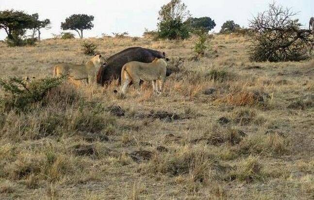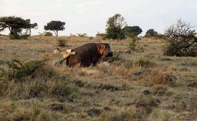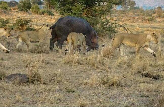 雌狮看到那么大的庞然大物,也不敢立即攻击,立即靠近打探敌情,大河马看到那么多雌狮过来,立即站起来,毕竟草原上,这是它们草原之王狮子的地盘,不是水里!