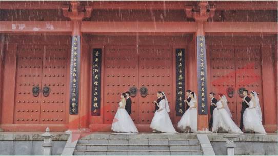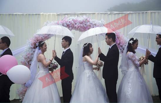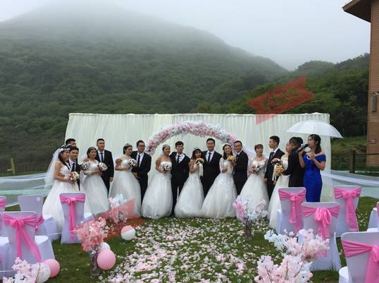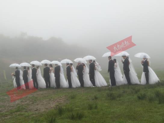 成都晚报记者了解到,在仪式当天,海拔2000多米的山顶大雾环绕,雨也下个不停。但这根本无法阻挡新人们内心的兴奋。第一次穿上婚纱、礼服,大家又开心又激动,细心的刘超还专门给每对新人准备了一对钻戒,“虽然是仿真的,但是大家都很珍惜”。