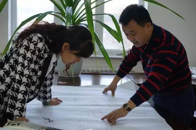 ▲ 于际方(右)和孙素娟在研究白狼镇规划图