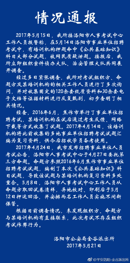河南省洛阳市公安局金谷派出所5月21日对“洛阳事业单位招聘考试考题疑遭泄题”一事发布通报,据新华社5月15日报道,洛阳市直和县区事业单位招考笔试结束后,有网友反映某培训机构考前押题命中了75道《公共基础知识》题中的70道,不少题目的题号、顺序、答案选项都一模一样,怀疑考试被泄题。金谷派出所通报称,根据目前调查情况,此次考试不存在组织方考试作弊行为。