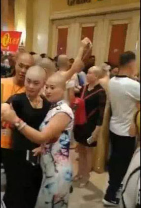 这段“和尚尼姑结婚”的视频,是在一个宴会场合拍摄的,其中的男女大多剃着光头,身着礼服,忙着合影,而不远处出现的标识上有三个字——“五行币”。