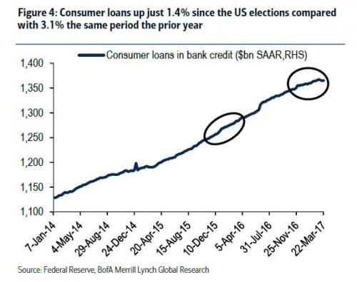 美银美林的经济学家指出,另外一项数据低于预期的硬性经济数据是美国经济信贷总额增速。按照最新披露的信贷增速数据来看,大部分美国消费者和企业都持观望态度,等待新一届美国政府披露税费改革以及财政刺激投资项目等政策的具体实施细节。这种情绪和实际行动之间中存在的差异,凸显了忽略硬性经济数据表现平平这一现象中隐含的市场风险。