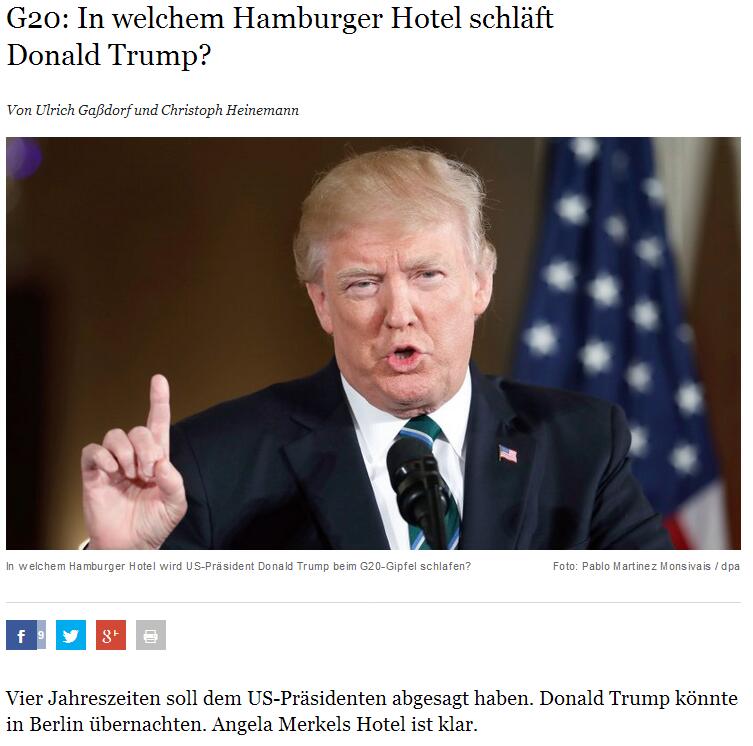 该报援引G20峰会主办方消息人士报道,特朗普因安全原因可能在柏林过夜。按照惯例,这一级别的客人一般下榻在勃兰登堡门对面且与美国大使馆比邻的“阿德隆酒店(Adlon)”。但柏林的酒店暂时没有收到任何华盛顿方面的入住请求。同时,警方消息人士称,所有出席柏林G20峰会的国家领导人将住在汉堡市中心。