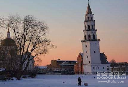 该斜塔位于俄罗斯斯维尔德洛夫斯克州的纳维亚斯基镇,是由当时著名的制造商Demidov家族在18世纪修建的。塔高57.61米,塔身倾斜0.82米。由于西南方是Demidov的出生地,所以塔身偏向西南。斜塔建筑采用了非常先进的工艺和技术,塔的金属部分至今丝毫没有生锈,另外考古学家推测如果塔建于1725-1732年,那么塔顶的避雷针就比富兰克林发明的还要早25年。
