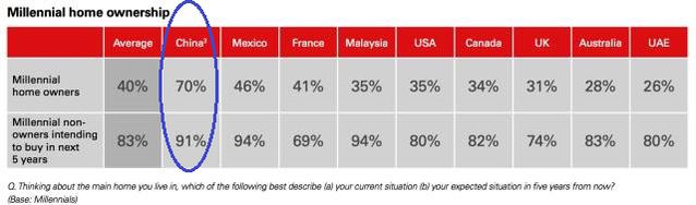 最近,汇丰银行通一项针对9个国家的调查发现,中国千禧一代(1981年至1998年出生)的住房自有率高达70%,在9个国家当中排名第一。调查显示,中国在九国中的住房自有率最高,为70%,仅次于中国的是墨西哥,千禧一代住房自有率达46%,第三至第九依次为:法国(41%)、马来西亚(35%)、美国(35%)、加拿大(34%)、英国(31%)、澳大利亚(28%)、阿联酋(26%)。