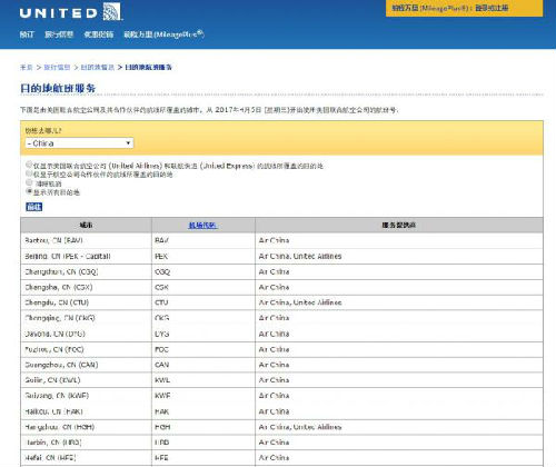 美联航中文官网上的部分中国目的地城市截图