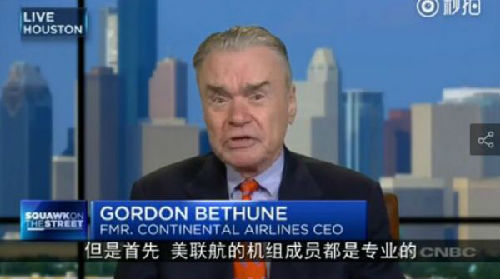 更令外界愤慨的是,美国航空界大老、大陆航空(Continental)公司前CEO戈登·贝塞恩在接受采访时公然力挺美联航暴力殴打乘客的做法,甚至批评受伤乘客“幼稚得像个孩子”。