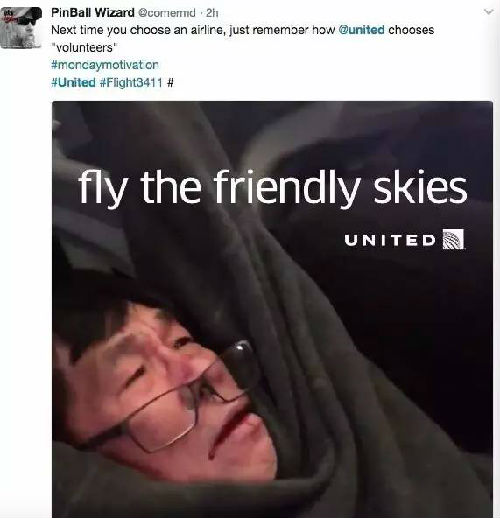 有网友讽刺称,美联航“新的座右铭”即是:“我们打不过竞争对手,我们就殴打乘客”。