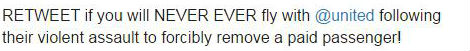 而被网友们转发次数最多的一句话则是:“如果你拒绝乘坐美联航的航班,那么请转发这条推文。”
