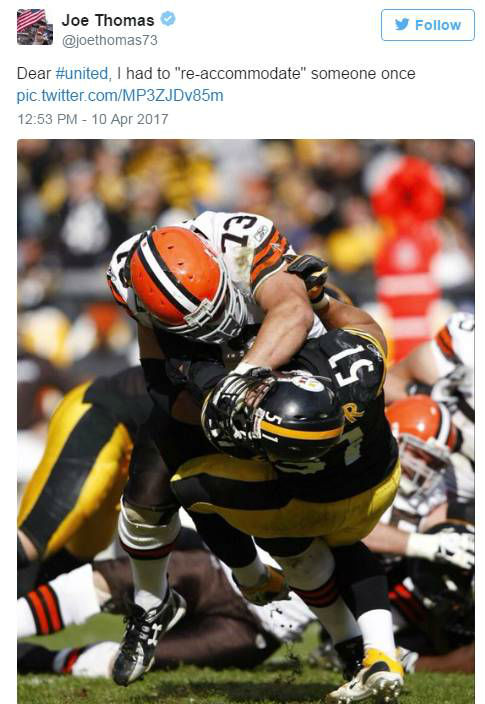 橄榄球明星乔·托马斯则发来嘲讽:“亲爱的美联航,我也曾‘重新安置’过某人呢。”