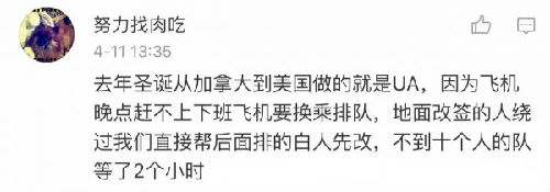 此外,还有网友回忆说,当年还没到美国,先在飞机上被美联航“震惊”:空姐对英语不好的中国老年乘客公开冷嘲热讽,互相挤眉弄眼……