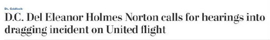《华盛顿邮报》报道称:“民主党议员爱莲娜·诺顿要求国会就此次美联航拖拽乘客事件召开听证会。”