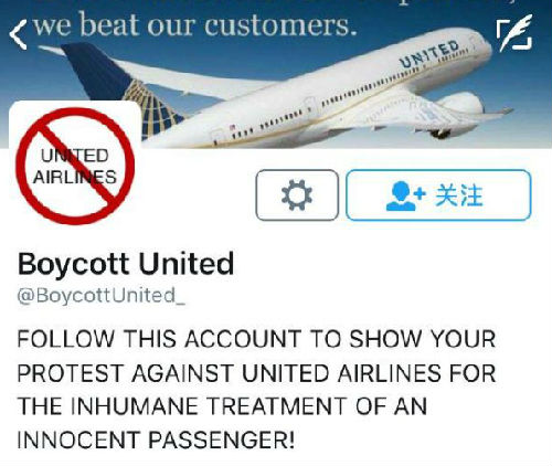 “抵制美联航”的推特账号截图