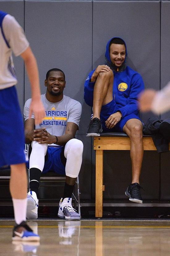 训练中,库里和杜兰特各种大笑、叫喊、互相咒骂,气氛和谐又欢乐。
