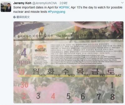 受邀前往朝鲜的新加坡亚洲新闻台Jeremy Koh此前一直在推特上直播此次的平壤之行,14日上午,他发布一条推特称,自己推测15日很可能会看到朝鲜核试验。