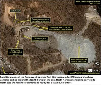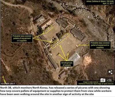 另据每日邮报消息,美国研究朝鲜问题的美国知名智库“北纬38度”(38 North)分析人员表示,根据周三(12日)商业卫星图像,平壤东北部丰溪里(Punggye-ri)核试验场活动频繁,包括试验场北方入口、主要行政区及指挥中心等地区,看到有人员进出。