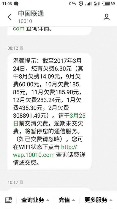 24日,市民黄先生也向东时记者报料,24日早上8点多他收到联通系统发来的欠费信息,信息显示截至2017年3月24日,他有欠费6.30元,之后信息中有个括号,里面是逐月欠费情况,其中2月欠费308891.49元。“看到信息我吓坏了,怎么可能会欠费那么多呢。”随后黄先生拨打了联通客服电话,客服表示是因为系统出错,才会有用户被欠高额费用。