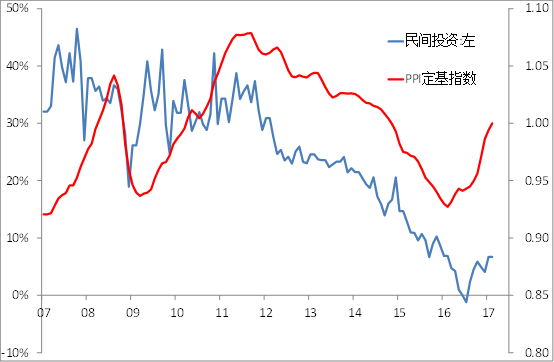 相较2016年初,民间投资增速大幅度回落,原因很简单——投资回报率持续下降,PPI的同比为负持续了近三年,到2016年的3月份才止跌为稳(同比9月份由负转正),尽管政府的基建投资在2013年之后就不断加码,但并不能有效刺激民间投资增速的回升,为此去年年中国务院还派调查组去各地了解民间投资不振的原因。