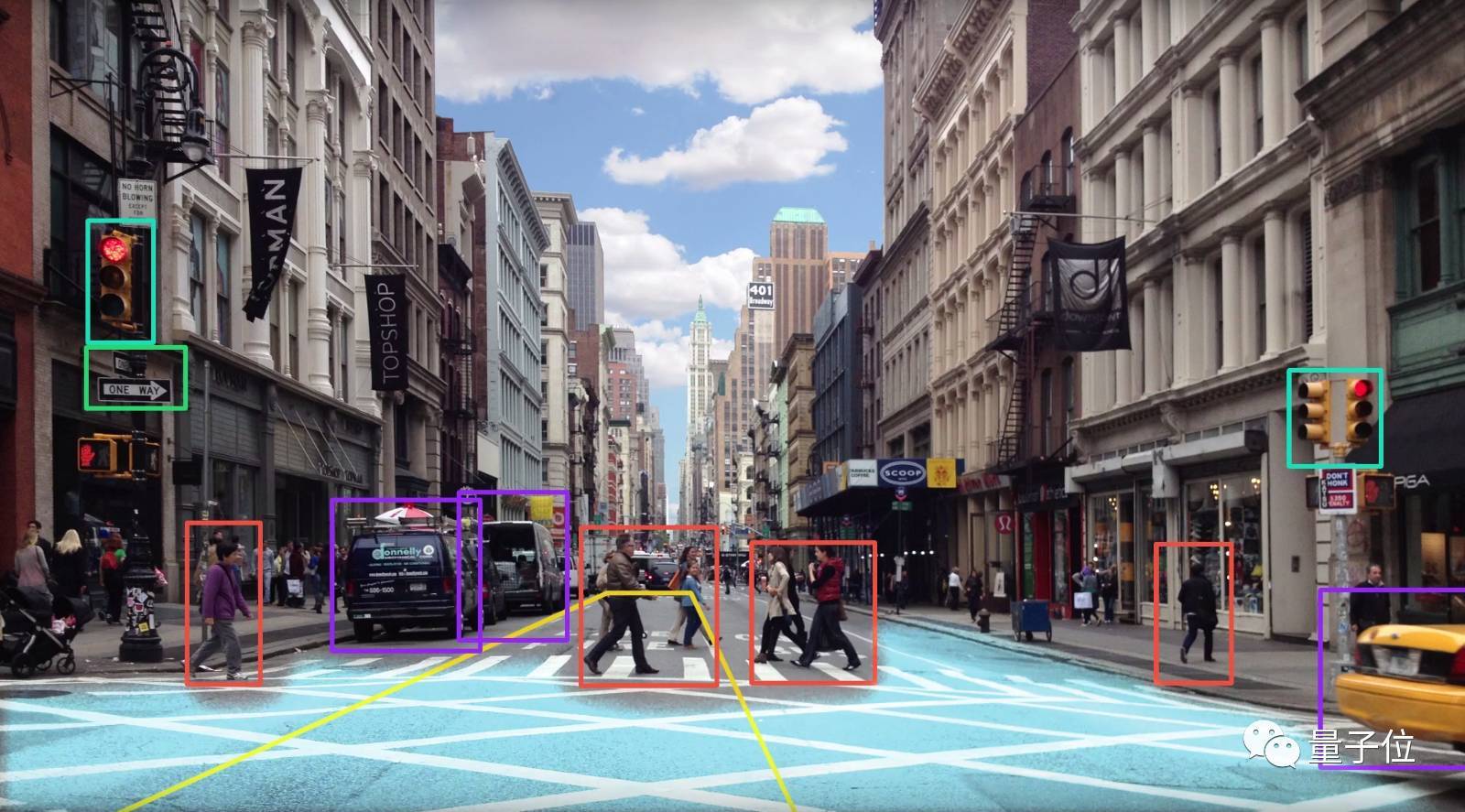 △车辆、行人、信号灯、指示牌……不同类别的物体被不同颜色的检测框圈起
