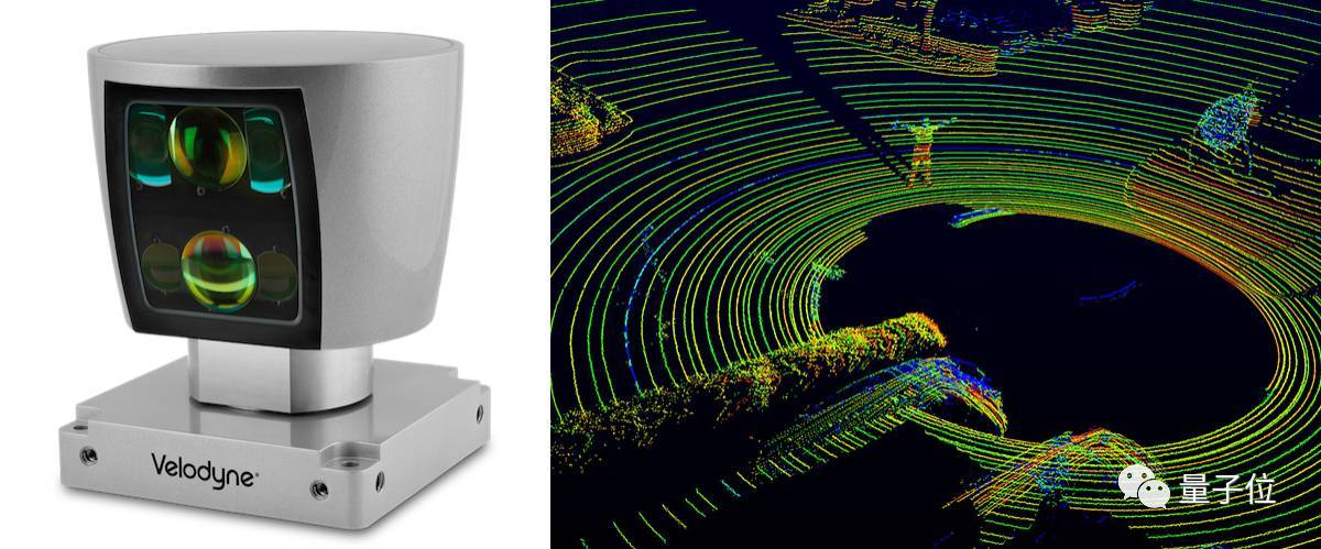 △激光雷达传感器(左)和采集到的点云数据(右)