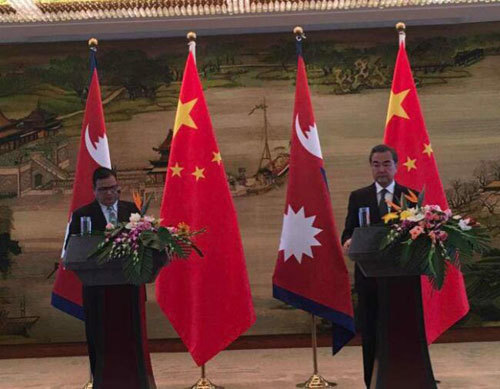 外交部长王毅与尼泊尔副总理兼外长马哈拉共见记者