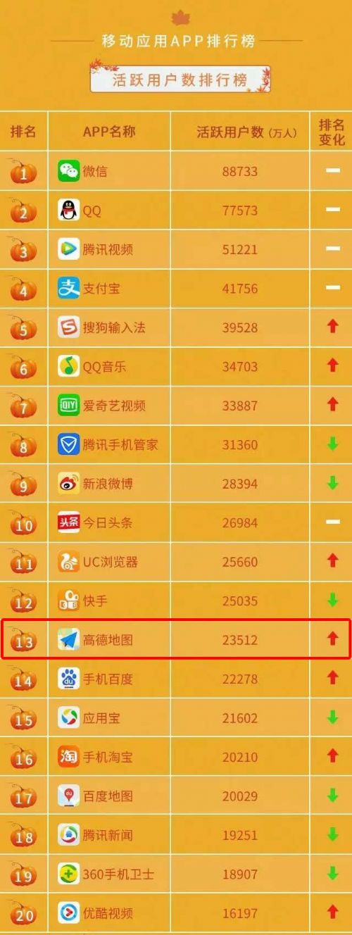 从上个月的2.1707亿月度活跃用户增长到本月的2.3512亿,高德地图增长率超过8%。在总榜单中,高德地图活跃用户数排在第13名,比上个月前进2名。