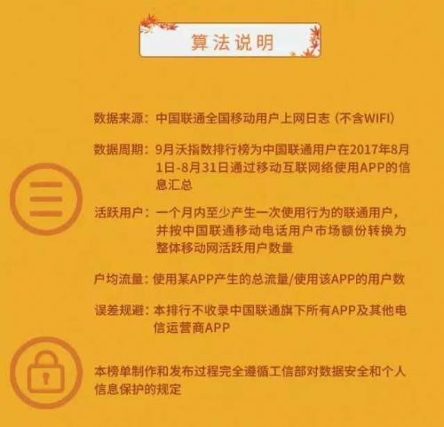 需要注意的是,9月沃指数排行榜的数据周期,为中国联通用户在2017年8月1日~8月31日通过移动互联网络使用APP的信息汇总。