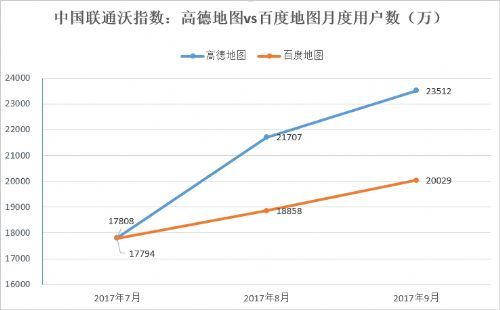 2017年9月8日,中国联通发布了最新的《沃指数之移动应用APP排行榜》,在地图导航分类榜单中,高德地图和百度地图位居前两位,活跃用户数分别达到2.3512亿和2.0029亿。