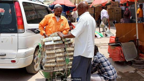 在索马里兰的哈尔格萨市,6名男子正围绕主街上一个色彩鲜艳的木制棚屋周围,高声争论着Khat(恰特草,被比作咖啡和可卡因的麻醉物)的质量,他们刚才匆忙将它们交给供应商。顾客们从里面出来,抓起这种当地可合法买卖的绿色叶状植物,认为它们已经足够好,并把所需购买钱数输入手机中付款,随后迅速消失。嘴里嚼着这种绿色植物的卖家奥马尔(Omar)说:“我们需要尽快做好有事情,在这里使用现金支付速度太慢。如果能迅速得到Khat,人们就能保持冷静。”