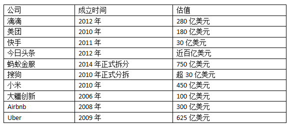 这些名列“上市传闻榜单”的企业主要有:搜狗、快手、美团点评、今日头条、滴滴、Uber、Airbnb。除去Uber和Airbnb这两家久居榜单的“老外朋友”,我们发现国内这几家独角兽都成立于2010年至2012年间。