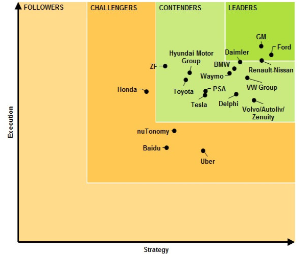 至于自动驾驶,就在特斯拉市值超越通用汽车不久前,一份来自Navigant Research的自动驾驶研究报告为 18 汽车厂商、供应商和技术公司进行了一次综合排名。其中,传统汽车厂商取得了绝对领先的优势。其中福特和通用分别排在第一和第二,特斯拉甚至根本没有进入前10榜单中。而在由领导者(Leader)、竞争者(Contender)、挑战者(Challenger)和跟随者(Follower)构成的自动驾驶竞争格局象限中,也仅是挑战者的角色。对此,Navigant的分析认为,特斯拉之所以排名靠后,是因为其产品质量、营销策略、财务的稳定性方面仍有诸多不足,而且其自动驾驶技术水平也难以做到 Level 4 以上的水准。尽管业内对于此份报告颇有争议,但Navigant Research的理由并非全无根据,尤其是在自动驾驶驾驶技术本身上。