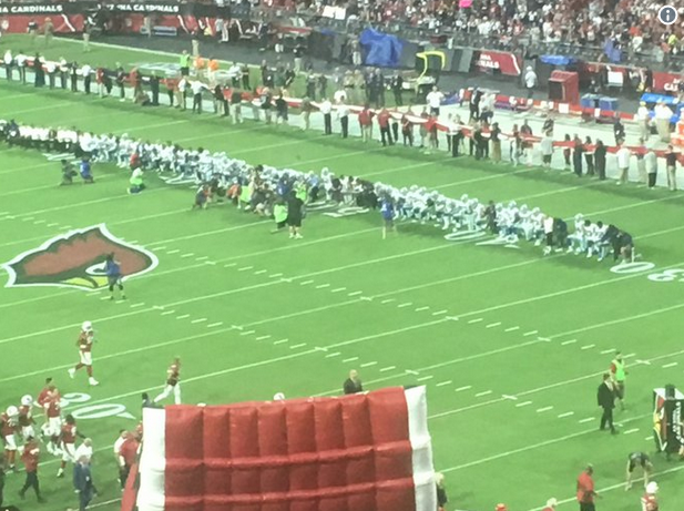 而与此同时,他们的对手亚利桑那红雀队队员也与场上安保人员站在一起,以示团结。