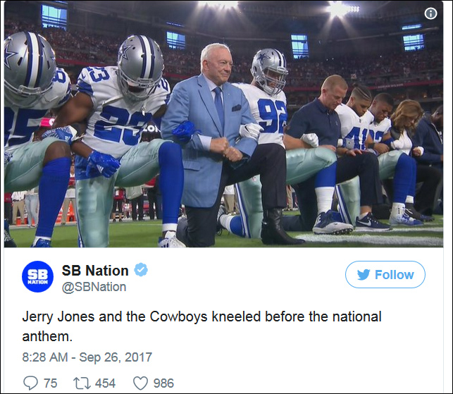 据《国会山报》报道,同样在当地时间25日晚间的一场比赛前,有“美国之队”之称的达拉斯牛仔队全队球员,以及球队老板琼斯(Jerry Jones)在奏唱国歌前跪在地上相挽致意特朗普。