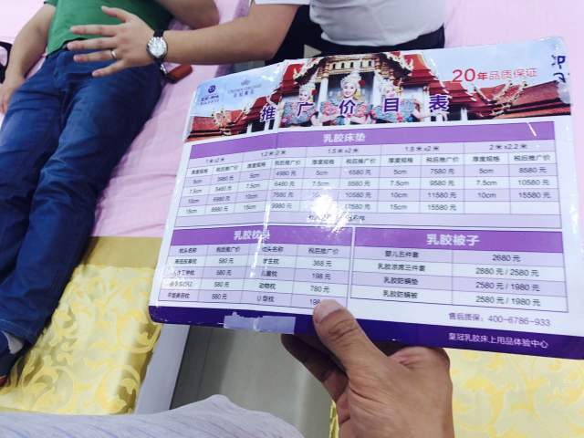 “皇冠乳胶”店推销员带记者一行体验乳胶床垫,提供“推广价目表”
