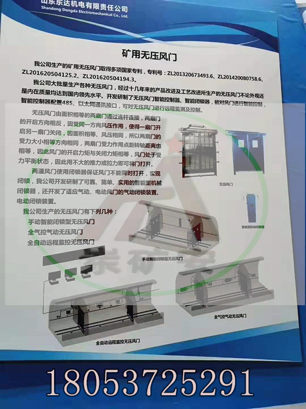 无压风门采用力平衡原理,两道双扇风门,每道风门为双扇钢制门框,异向同步开闭,运用联杆平衡机构转化为一种内力,并得到平衡,保证了风门打开时省力、方便、灵活。