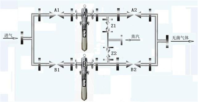 运行可以同时使用 A B 二台过滤器①.打开 A1 A2 B1 B2 阀门,②.关闭 Z1 Z2 阀门