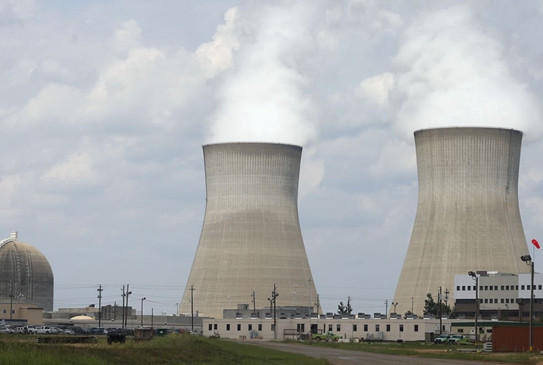 西屋电气在美国佐治亚州的Vogtle 核电站的冷却塔(右)和安全壳(左)。