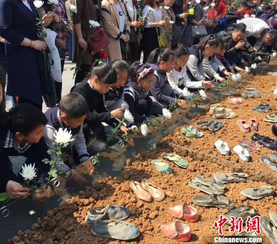中新网南京4月3日电 (记者 朱晓颖)3日,80双象征南京大屠杀遇难者的陶鞋在侵华日军南京大屠杀遇难同胞纪念馆展出。南京大屠杀幸存者等代表,将从17个南京大屠杀遇难同胞丛葬地取出的泥土,洒在这些色彩、形态、大小不一的陶鞋上。