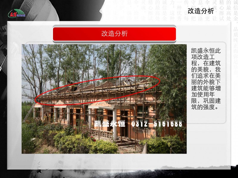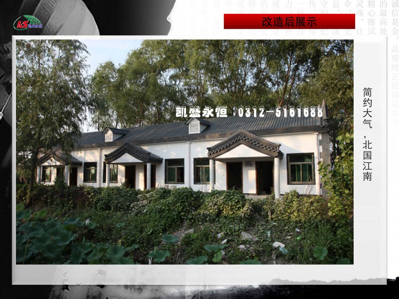 凯盛永恒建筑材料制造有限公司数年来坚持以诚为本,质量第一的企业宗旨,获得了社会各界的广泛认可公司产品--合成树脂瓦,引进先进的科学工艺技术,选用过节著名跨国公司研发的超高耐热性工程树脂精制而成。公司产品色彩丰富并经久不退,造型美观立体感强等突出特点。同时,合成树脂瓦具有防水、坚韧、保温隔热,隔音、抗腐蚀性,绿色环保,安装简便等优点。