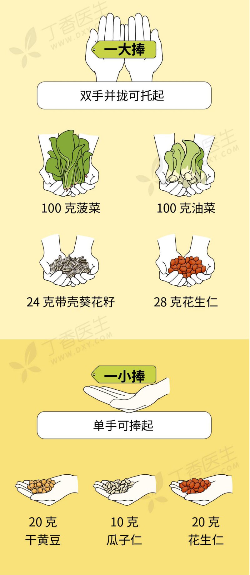 蔬菜类: 1 ~ 2 大捧(双手)的新鲜蔬菜和 1 捧菌菇,加热后蔬菜体积会变小,所以这么多还是吃得完的;