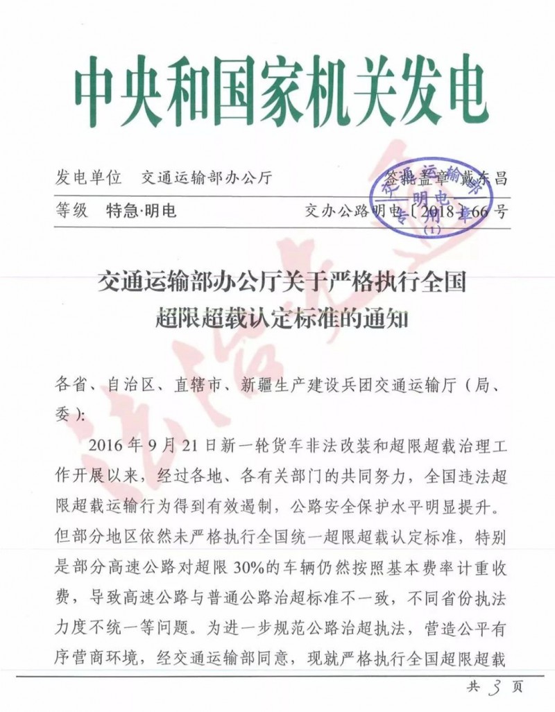 特别强调了:部分地区依然未严格执行全国统一超限超载认定标准,部分高速公路对超限30%的车辆仍然按照基本费率计重收费,导致高速公路与普通公路治超标准不一致,不同省份执法力度不统一等问题。