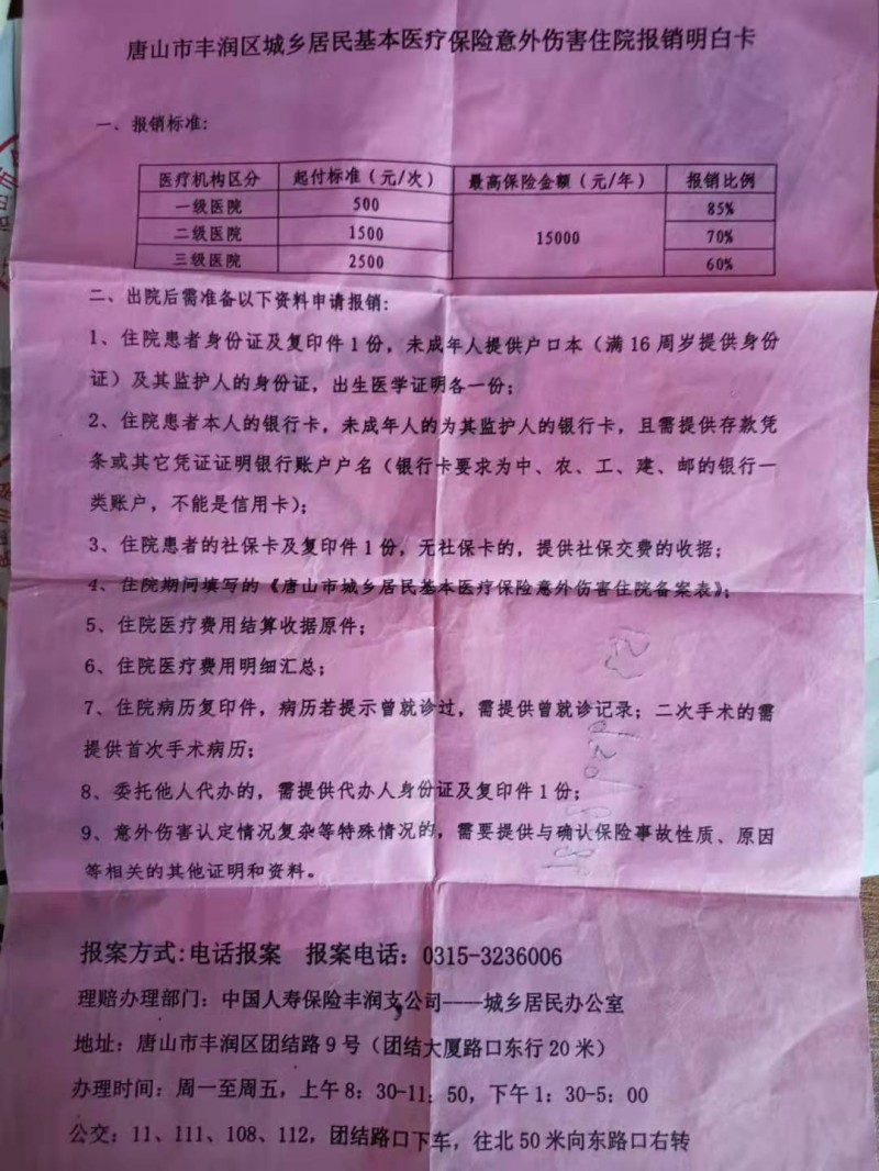 我们好多的老百姓都不懂自己出现意外自己能报多少钱,并且有些农民连报案都不懂,我把这张明白卡公布给大家以便大家不时之需,并且有问题大家也可以随时来找我,我希望为大家24小时免费保险咨询服务:15032941555
