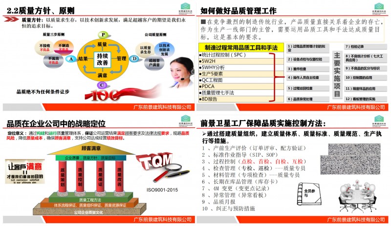 通过搭建质量组织,建立质量体系、质量标准、质量规范、生产执行等措施,是前景建筑科技保障品质实施控制的方法;保证公司运营结果满足顾客要求及法律法规要求、规避品质风险、降低质量成本、支持公司达成经营绩效目标这是定位意义,让客户满意才是前景的最终目的。