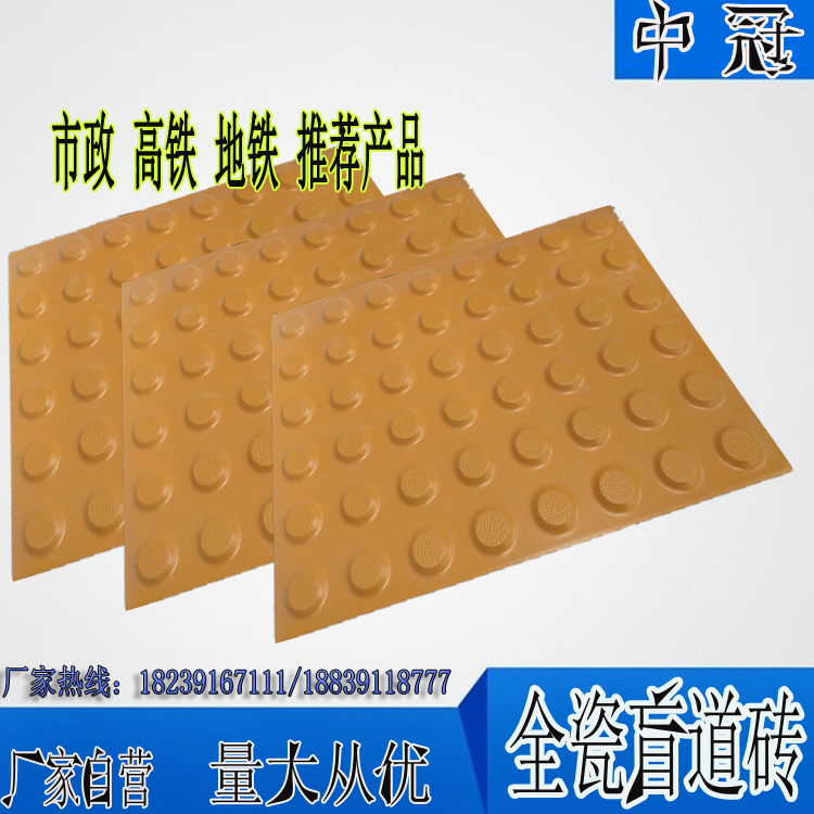 中冠全瓷盲道砖---通过质朴而深沉的黄色,自然演绎一幕幕“峥嵘岁月”,仿佛岁月叠连的年轮、斑驳晕染的旧信纸;抽象纹理,采用***的配方,该产品从外观、实用等方面取代了石材、水泥、金属、塑胶等盲道材料,其色泽**醒目、美观大方。中冠盲道砖厂家--烧制出的盲道砖质地细腻,坚硬,“材美”使它在盲道砖的发展道路上得天独厚,名扬海外。可见,材料的好与坏直接分出了作品的优良程度。中冠盲道砖--按行业标准规定的盲道尺寸规格生产的,主要用于城市道路及火车站、汽车站、地铁站台、城际铁*,人行道上的铺设。