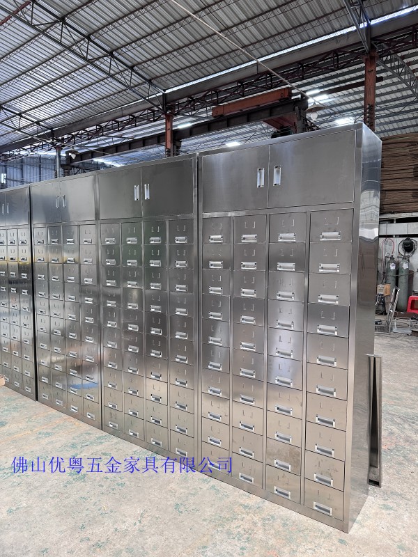 佛山市一抽三斗钢木中药柜全钢中医柜定做医院诊所中药柜工厂一组中药柜由两块侧板,一块顶板(或灯箱顶端),一块底板,64个小屉子组成